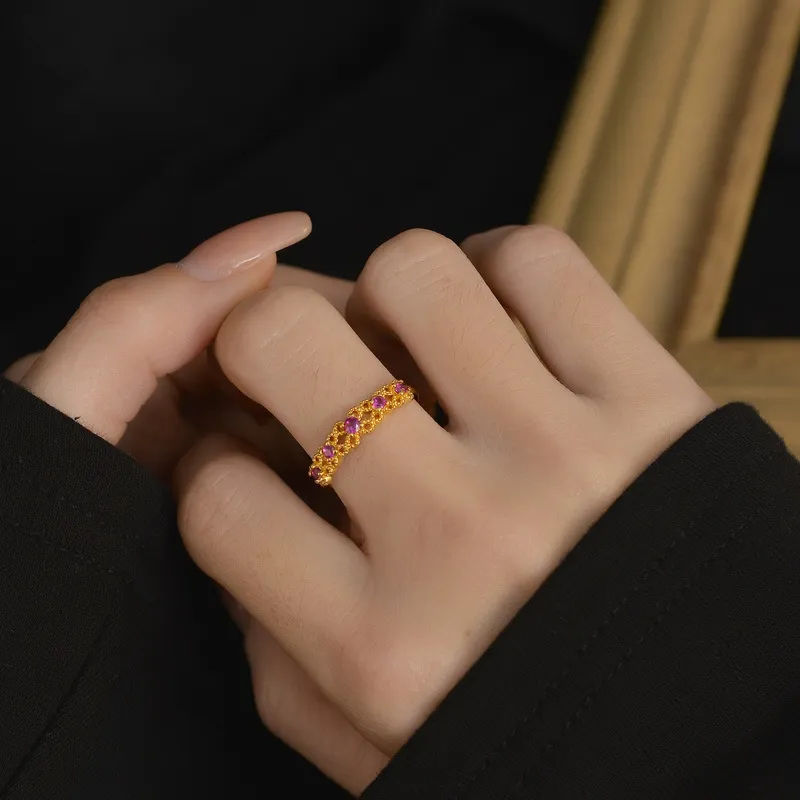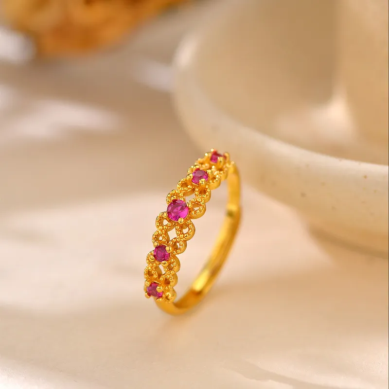 Accent Stones: Multiple round red Cubic Zirconia set along the band